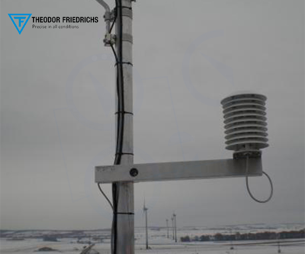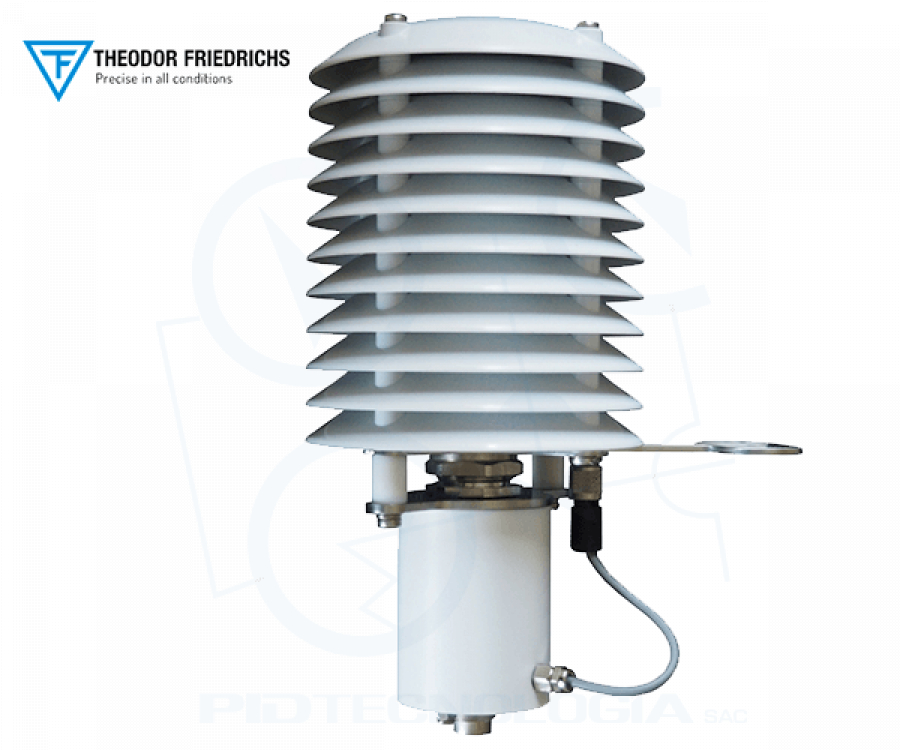 El sensor se utiliza para medir la humedad relativa y la temperatura del aire. Se utiliza un elemento de medición capacitivo para la medición de la humedad relativa y Pt 100 para la medición de la temperatura del aire. Ambos sensores se encuentran en una sonda de medición, protegida por un filtro de membrana. La sonda de medición está construida en un refugio de protección contra la radiación de un plástico de color blanco definido.